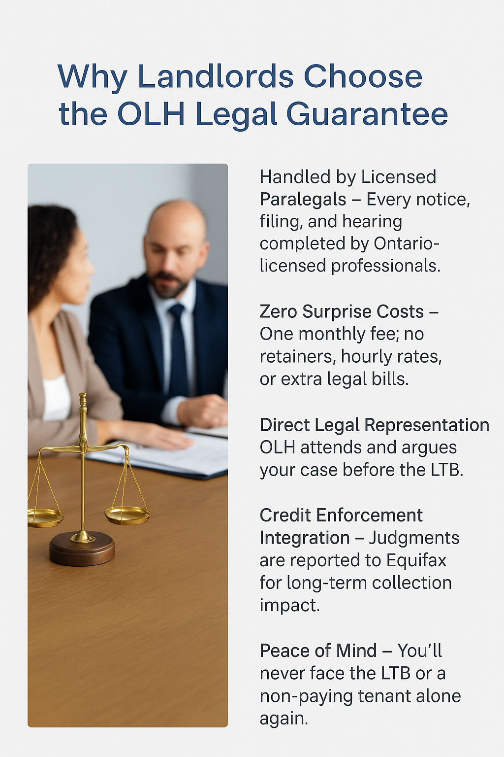 With the OLH Legal Guarantee Program, every notice, filing, hearing, and enforcement step is managed directly by our licensed paralegals — Ontario’s only fully integrated legal property management team.